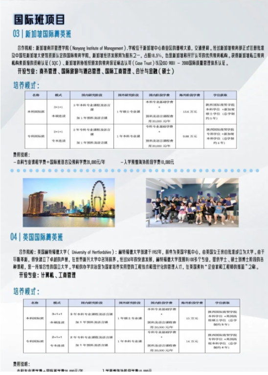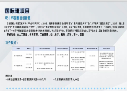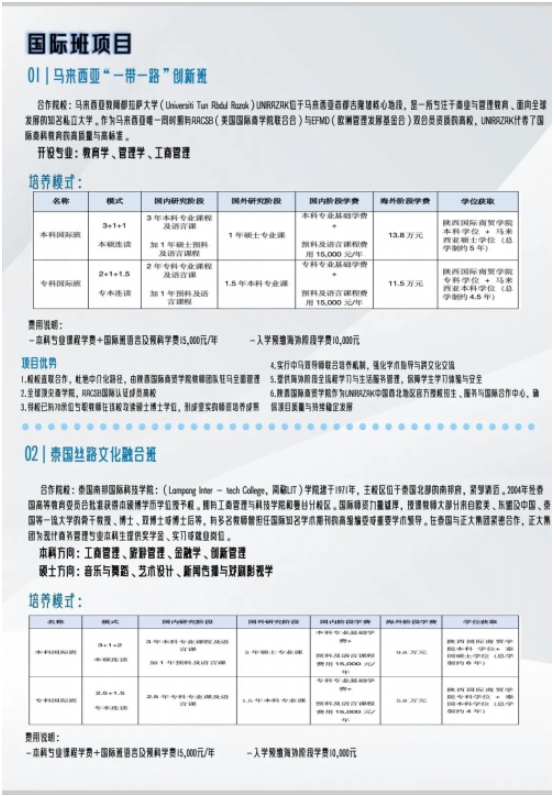 新增马来西亚“一带一路”创新班(本科国际班:3+1+1本硕连读);韩国赋能创新班(本科国际班:4.5+0.5本硕连读);新加坡菁英班(本科国际班:3+1+1本硕连读);英国国际菁英班(本科国际班:3+1+1本硕连读);泰国丝路文化融合班(本科国际班:3+1+2本硕连读)。培养学生成长为具有国际视野的应用型高级人才。