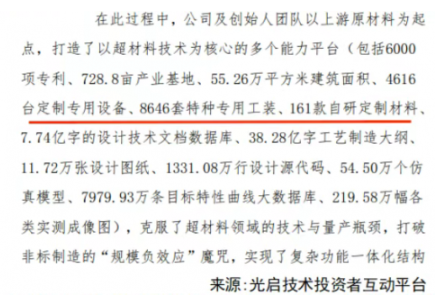 更厉害的是,光启技术连生产设备都自己定制研发,累计设计了4616台专用设备、8646套特种工装和161款自研材料。这意味着,它的整个生产体系都是独一无二、无法复制的,实现了全面的国产化替代。