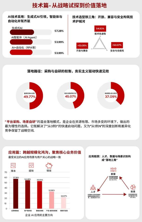 报告还揭示了企业在技术选型上的理性回归。企业不再盲目追求技术先进性,而是更加注重技术的开放性、兼容性与安全性。这种理性认知促使企业在技术选型时综合考量技术与业务的适配性,避免因技术孤岛或供应商锁定而制约AI的长远发展。例如,企业在选择生成式 AI 技术时,会优先考虑其是否支持多模型、多框架、多云部署,以应对技术快速演进带来的不确定性。