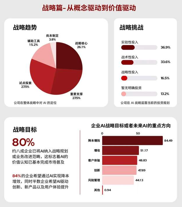 报告深刻指出,2025 年是中国企业 AI 应用迈向规模化落地的关键转折点。企业对 AI 的认知已从前沿技术转变为战略核心,AI 的价值不再局限于局部优化,而是全方位重塑企业竞争力。报告中的“三分格局”揭示了企业 AI 战略成熟度的差异,既有将 AI 视为战略核心的先锋企业,也有处于试点探索阶段的观望者,更有将其仅视为辅助工具的保守派。这种多元化的战略定位,凸显了企业在 AI 赛道上的分化态势。
