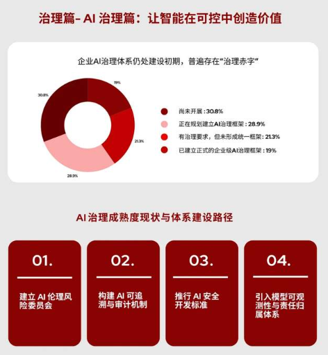 随着AI在企业中的深度应用,其治理问题愈发凸显。报告指出,当前企业AI治理体系仍处于建设初期,普遍存在“治理赤字”。企业在AI治理中面临技术稳健性、合规安全与业务连续性三大风险,亟待构建完善的治理框架。