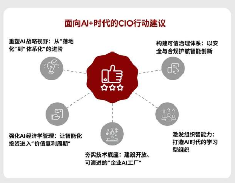 报告最后为CIO提出了面向AI+时代的五项行动建议,为CIO的角色转型绘制了清晰的蓝图。CIO需从“技术供应商”进化为“智能战略架构师”,主导构建涵盖战略、技术、人才、治理四大支柱的AI能力体系。