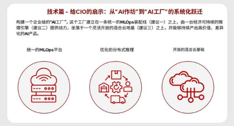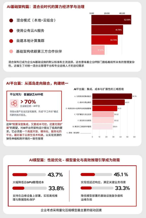 此外,报告针对AI应用落地过程中的技术瓶颈提出了切实可行的解决方案。如在AI基础架构领域,混合云模式成为主流选择,企业通过混合云架构平衡了成本、安全与敏捷性;在AI平台建设方面,企业亟待打破技术孤岛,构建统一的MLOps平台,实现AI开发流程的标准化与流水线化,基于云原生技术构建一个高度开放、模块化、服务化的平台,实现资源的弹性伸缩和跨环境的一致管理;在AI模型方面,掌握AI经济学,从“算力堆砌”转向“AI FinOps”的精细化运营思维,利用vLLM及llm-d等开源技术降低推理成本,最大化硬件利用率。这些技术层面的洞察与建议,为企业在AI技术应用中提供了明确的指导方向,助力企业提升技术应用效率,加速AI价值落地。