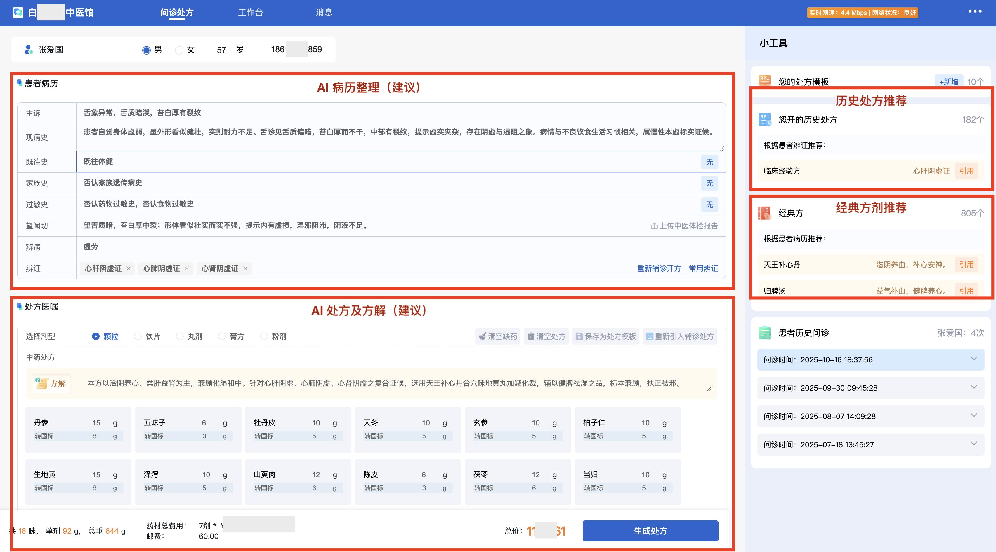 2025年7月,智明堂ZMT-M1模型已在银川、西安8家中医门诊中试点应用,9月扩展至全国100余间诊室。AI完成病历整理、处方建议、经典方剂推荐、方解自动生成等功能,单店接诊效率提升了115%,用户处方支付率提升34%,复诊率提升25.8%,实现年轻医生经验补足、资深医生效率倍增的双赢,首次证实了中医大模型具备临床辅助级能力。