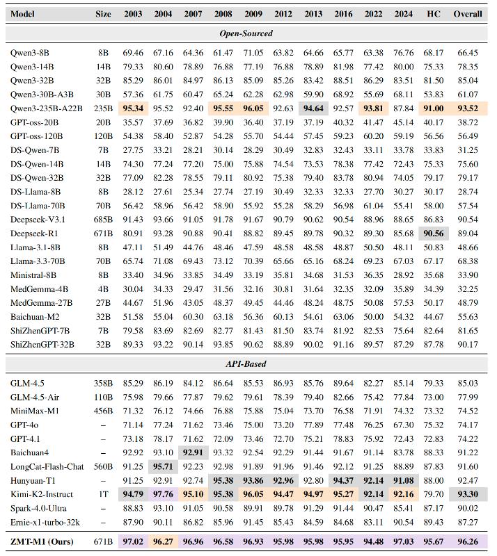 图:已参与测试大模型的主实验结果,智明堂ZMT大模型以96.26的高分斩获迄今该领域最佳成绩
