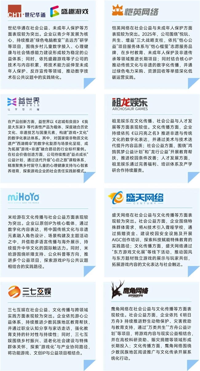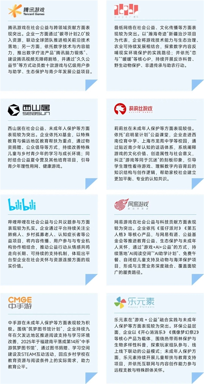在产业之外,2025年伽马数据延续企业评选传统,从数十家企业中选出履责属于头部,以及在某项上表现突出的代表企业,为产业提供更多参考。