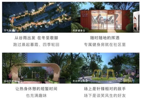 结合地铺设计各节气图案及节气介绍,分段设计全龄健康慢跑,丰富运动乐趣,增加跑者参与互动感的节气跑道;串联不同运动类别区域,让热身休憩的短暂时间也充满趣味的运动充能站;手机预约、24h开放,适合快节奏的城市居民的社区共享健身仓……