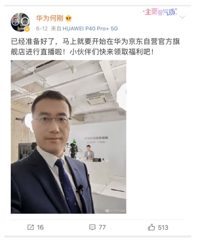 “来,倒数5个数!5、4、3、2、1,恭喜屏幕里这两位花粉宝宝获得易烊千玺的签名海报!”618期间,华为手机产品线总裁何刚在微博上高调预热后,一开场就十分娴熟地为京东的粉丝们抽了两份“四字弟弟”签名海报,类似这种大佬下场直播站台的场景在京东618接连上演,京东也成功引领总裁直播带货新风向,成为商家线上最大增量场。