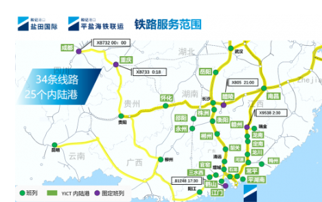 近年来,盐田国际积极拓展多式联运网络,通过构建“国际航线+铁路动脉+驳船支线”的立体化物流体系,将港口服务延伸至内陆腹地,为内陆外贸企业提供一站式、稳定快捷的全链条物流解决方案,为市场提供“密、多、快、高”的优质海运服务,无缝连接国铁网络及其他国内港口,覆盖大湾区、西南及中部地区。截至2025年10月,盐田港已布局25个内陆港+34条海铁联运线路,15个大湾区组合港+17条驳船支线。