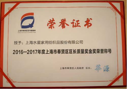 为持续提升质量水平,水星家纺在行业内率先导入卓越绩效模式,并成为上海市奉贤区推行卓越绩效及5S管理的标杆企业,其产品质量、工程质量、服务质量和环境质量整体水平不断提升,达到了行业领先标准,先后获得上海市奉贤区“区长质量金奖”、“全国家纺行业质量领军企业”、“中国百强上市企业”等殊荣。