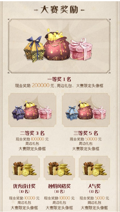 本次比赛总奖池高达百万现金,一等奖的奖金足足有20000元之多。另有大赛限定头像框、周边礼包等丰厚奖励!获奖作品还将有机会成为游戏内时装!玩家的设计图将不在提留纸上,优秀的设计作品将会被更多玩家所看到,甚至成为学院潮流的风向标。本次设计大赛赛程时间如下: