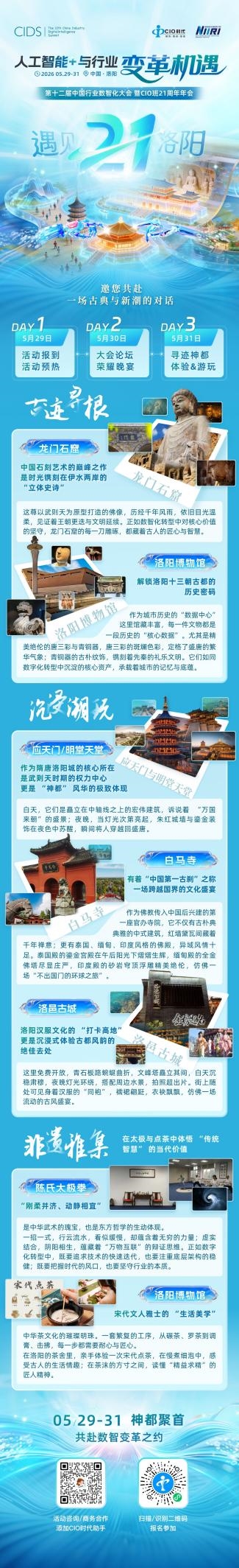 当数字化转型的浪潮奔涌向前,当千年古都邂逅数智未来,一场连接历史底蕴与时代机遇的盛会即将如约而至——中国·洛阳,即将迎来一场古典与新潮的对话。2026年5月29—31日,由 CIO 时代主办、新基建创新研究院作为智库支持的“人工智能 + 与行业变革机遇 | 第十二届中国行业数智化大会暨 CIO 班 21 周年年会” 落地十三朝古都洛阳。中国·洛阳,这座见证了华夏文明鼎盛时刻的城市,正以古典与新潮共生的姿态,等待着每一位深耕数智领域的先行者。